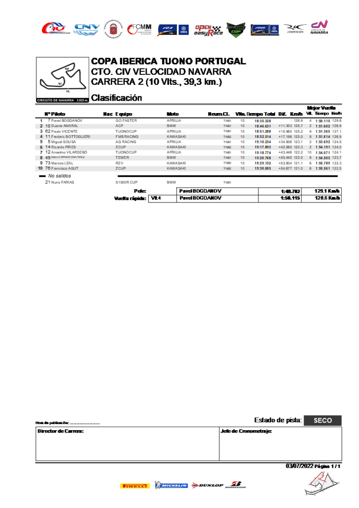 Atrás destes, chega a primeira Z, a de Bottoglieri, sózinho no quarto lugar da geral, seguido pela Tuono de Sousa e a S1000R de Perez, algo distanciados entre si, deixando as escaramuças finais para as Zs de Leal, Pires e Agut, terminando estes nesta sequência, depois de na volta 6, a Z de Leal ter subido para a frente do grupo, deixando Pires a discutir o último lugar no pódio TNB2, com a Z de Agut. A Tuono de Vilardebó sofreu a opção pelo pneu E, mas foi melhorando os tempos volta-a-volta, resguardando-se para a corrida do dia seguinte. O calor que se fez sentir não deu tréguas, mas tal não impediu a Tuono de Bogdanov de estabelecer a referência das naked-bikes ao registar a volta mais rápida em 1:49,462.