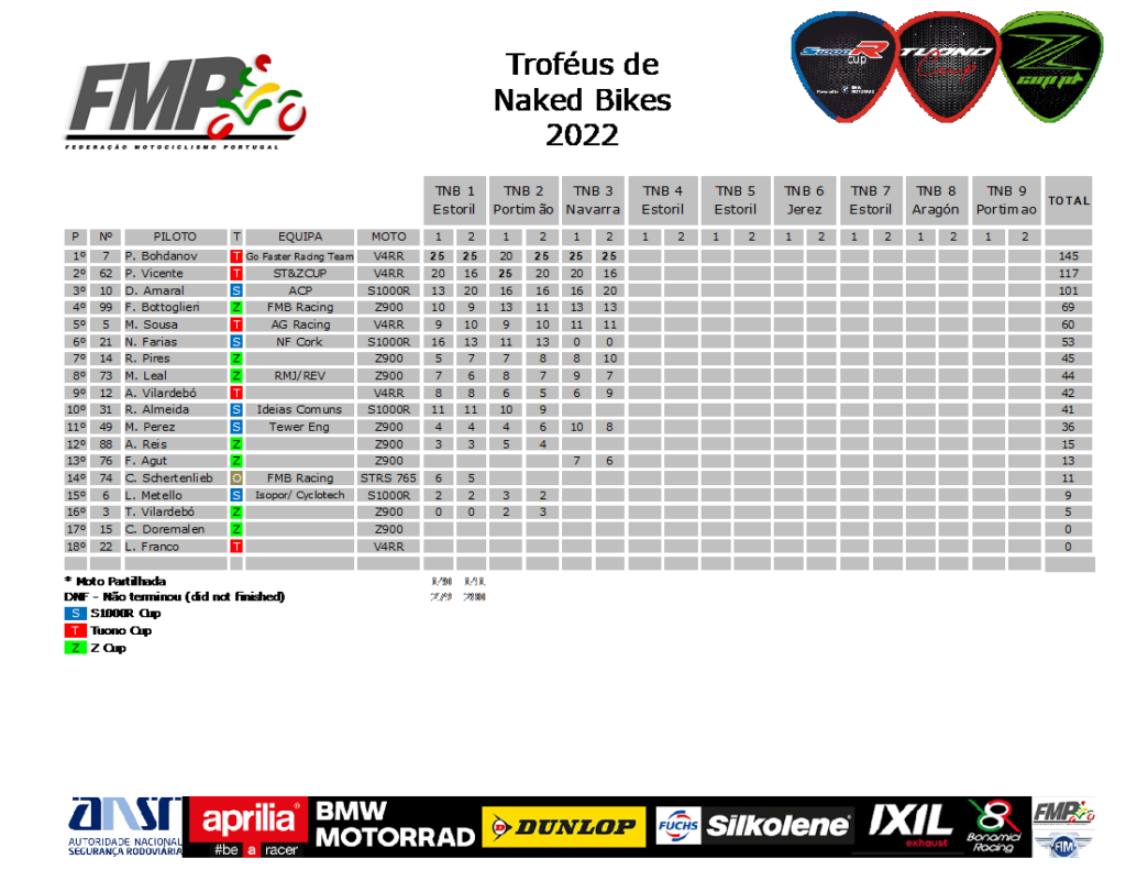 Os treinos livres de sexta-feira, feitos em conjunto com motos de outras categorias com ritmo equivalente, ditaram a hierarquia que iria marcar o fim-de-semana e que se reflectiu nos treinos cronometrados, com a pole a ir para a Tuono de Pável Bogdanov #7, o único a conseguir rodar no segundo 49, seguido pela S1000R de Duarte Amaral #10 e da Tuono de Vicente. A abrir a 2ª linha, ficou a melhor Z, a de Frédèric Bottoglieri #11, seguido da Tuono de Miguel Sousa #5 e da S1000R de Marco Perez #49, com este trio de nakeds tão diversas, a demonstrar que os pilotos e as características dos circuitos, fazem mais diferença que as diferenças técnicas entre motos. A Z de Ricardo Pires #14, ficou na frente da linha 3 e também da Z de Agut, que por sua vez conseguiu superar a Tuono de Anselmo Vilardebó #12, ficando a Z de Marcos Leal #73, com a lanterna vermelha.