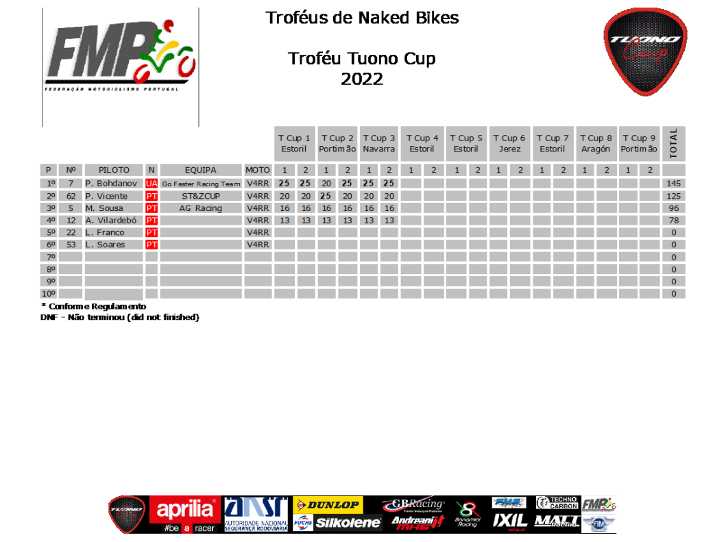 Terminada a terceira ronda da época, os participantes dos 3 troféus (S1000R Cup, Tuono Cup e Z Cup), ainda a recuperar o folego, rumam já para a ronda seguinte, a realizar no Estoril, de regresso ao CNV Moto, já no próximo fim-de-semana de 9 e 10.
