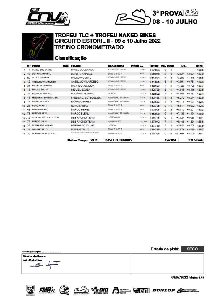 Atrás da Tuono de Bogdanov, ficou a mais rápida das BMW, a S1000R de Duarte Amaral #10, seguida pela Tuono de Vicente #62. Na 2ª linha, e a subirem de ritmo, ficaram as Tuono de Anselmo Vilardebó #12 e a S1000R de Ricardo Almeida #31, na frente da Tuono de Miguel Sousa #5. As Zs mais rápidas, as de Frédèric Bottoglieri #11 e Ricardo Pires #14, fecharam a 3ª linha atrás da mais rápida das TLCs, a de Rodrigo Amaral #t34. As S1000R de Farias e Marcos Perez #49, preencheram a 4ª linha, na frente da Z de Marcos Leal #73. Mais atrás, Luis Metello #6, ensaiava novas soluções no assento da moto tendo conseguido deixar a última, das poucas TLCs presentes, fechar a grelha de partida, apesar de esta não ter respeitado o limite de 115% que o Regulamento do CNV exige, ao ter registado um tempo acima de 2:04,078.