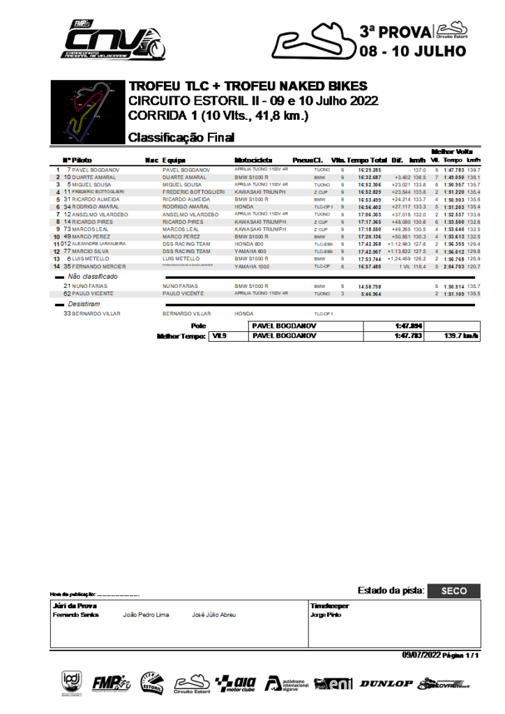 O acidente de Farias, quase fazia esquecer o duelo que as Zs de Pires e Leal travaram a partir do meio da corrida, com a S1000R de Perez a “atrapalhar” a contenda. Com Perez “no meio”, cada volta ditava um vencedor diferente deste duelo. De tal forma, foi intenso, que até passaram os dois a S1000R de Perez sem este quase se dar conta! Nesta sequência de ora-um, ora-outro, Leal não contou com a bandeira vermelha, e assim foi Pires a ficar com o 2º lugar de entre as Zs. Esta época está a ser animada! A S1000R de Metello, ainda à procura da harmonia com a moto, mas também a sofrer a exigência das condições adversas de temperatura, fechou a classificação do troféu e da geral, depois de ter rodado no ritmo das outras TLCs e sempre abaixo dos 115%.