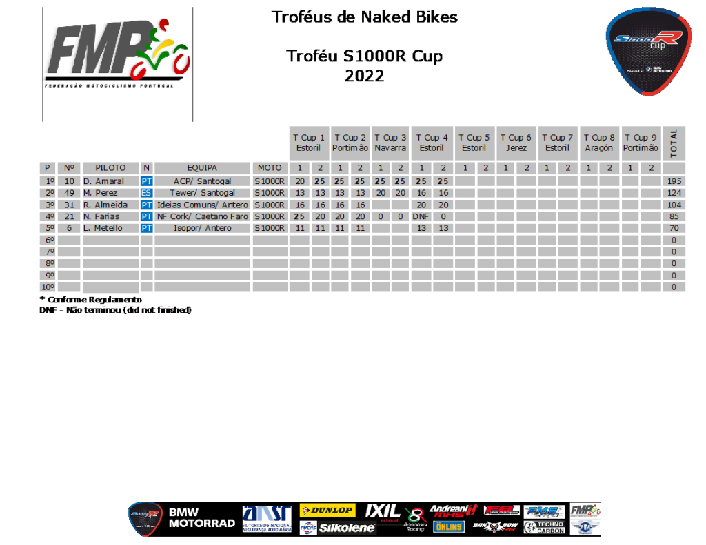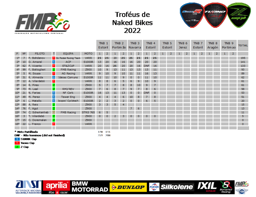 Foi um fim-de-semana tórrido, com temperaturas a pedirem banhos e não saunas, com histórias boas e menos-boas a pedirem a merecida pausa de verão, para recuperar corpos e máquinas e voltar a animar as próximas 5 rondas desta época. Rondas estas, a realizar entre Setembro e Novembro, entre Estoril, Jerez, Aragón e Portimão, com a próxima ronda a acontecer de novo no Estoril, mas no fim-de-semana de 16 e 17 de Setembro. Rondas que prometem algumas novidades. Fiquem atentos! Nas contas dos troféus, depois da ronda 4, temos: