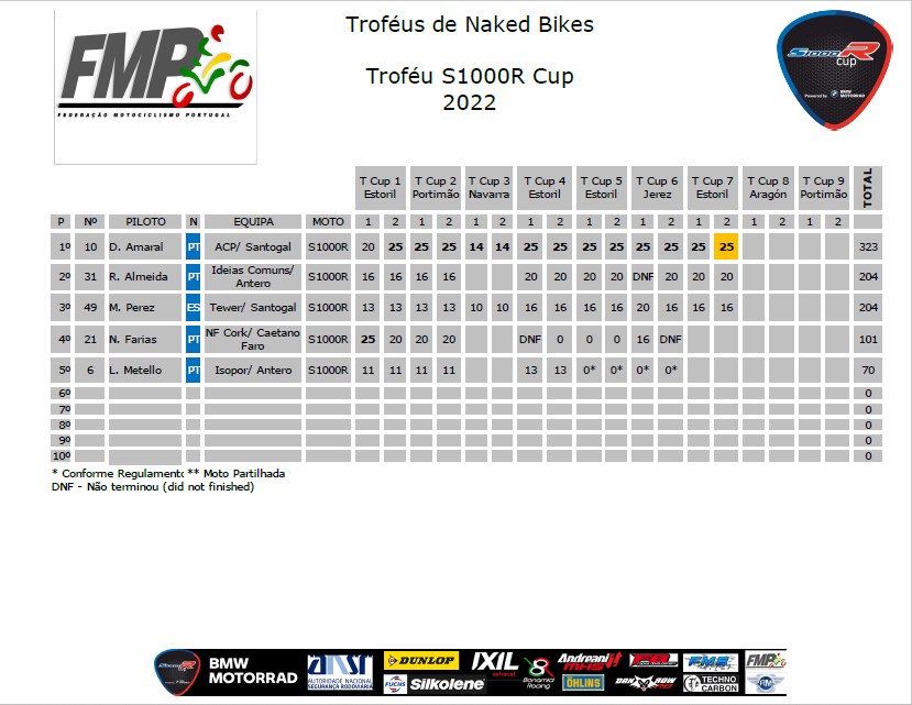Terminada esta sétima ronda da época, os participantes dos 3 troféus (S1000R Cup, Tuono Cup e Z Cup) e “outras naked”, seguem já no próximo fim-de-semana para a ronda de Aragón, a segunda do “triple header” e última com o CIV, regressando depois a Portugal, para terminarem a época no fantástico circuito de Portimão, no fim-de-semana de 19 e 20 de Novembro. Nas contas dos troféus, depois da ronda 7, temos: