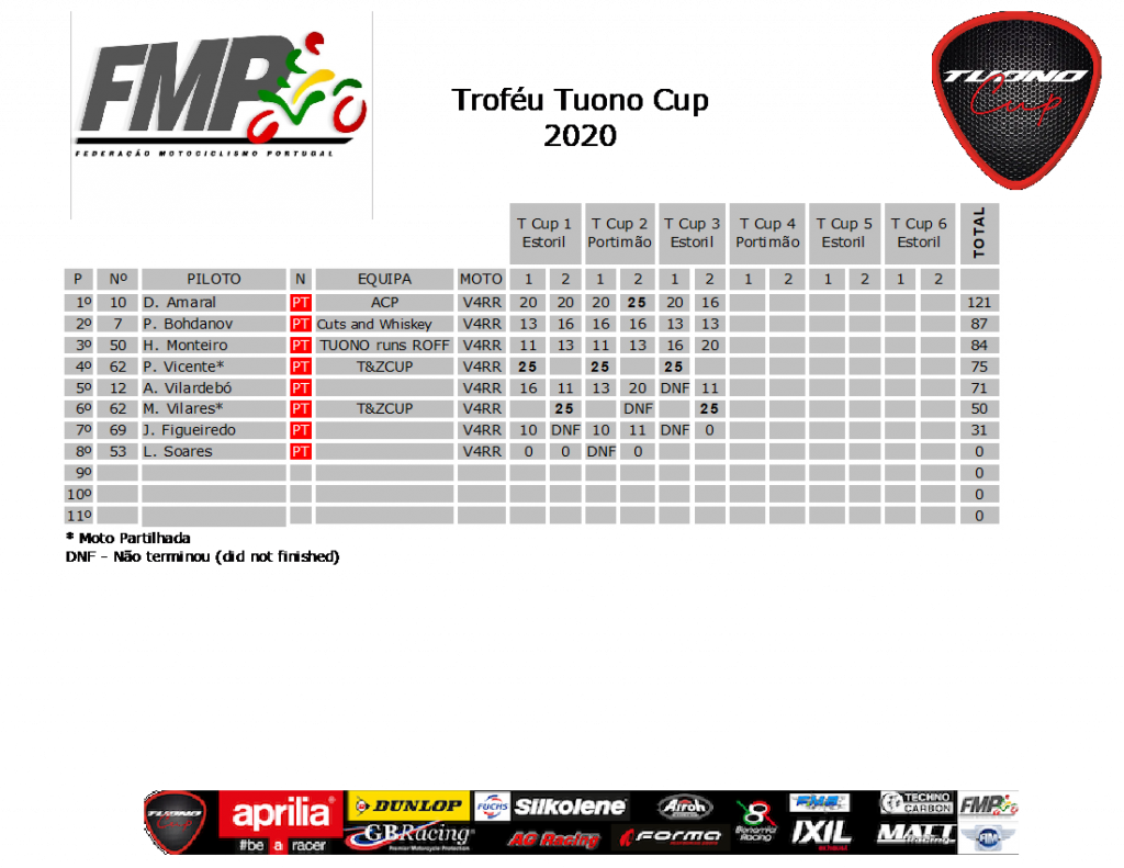 Do trio de Tuonos, em batalha para o 3º lugar, Vilardebó e Hélder, entre a 7ª e a 8ª volta, conseguem chegar ao 4ª lugar da geral, ao despachar o líder das Zs, Vilares, que conseguiu aguentá-los até aí, rodando regularmente no segundo 53. Bogdanov, não consegue fazer o mesmo deixando para os outros dois, a luta para o último lugar do pódio. Estes dois aplicam-se, rodam consistentemente no segundo 52, mas na última volta, na entrada para a variante, Vilardebó abre “a porta” e Hélder aproveita imediatamente! Vilardebó, na tentativa de recuperar o lugar, prepara a estratégia para a saída da parabólica, mas vê-lhe fugir a frente a mais de 150 Kmh, nessa rápida curva, terminando aí a sua corrida, felizmente sem danos físicos de maior! Ufa, ainda bem! Bela corrida fizeram os dois, conseguindo Hélder ascender pela primeira vez ao pódio com todo o mérito!